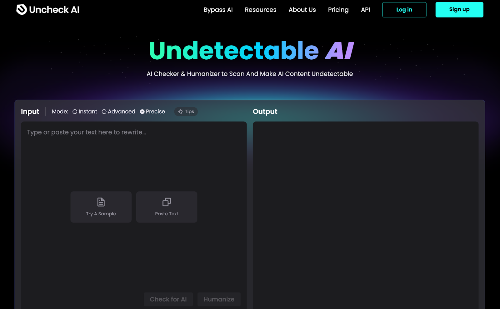 Stealthly — це потужний інструмент штучного інтелекту, який чудово справляється з неймовірною швидкістю та ефективністю переписування вмісту штучного інтелекту. Все це займає кілька секунд, і це точно спроектовано, щоб гарантувати, що весь вивід не містить будь-яких граматичних, пунктуаційних або синтаксичних помилок. Крім того, він може похвалитися показником успішності 96%+ в обході виявлення ШІ, що робить його надійним рішенням.