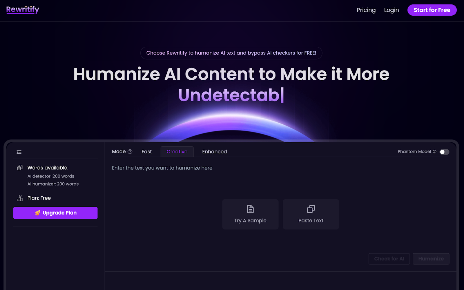 Крім того, Rewritify має вбудований детектор штучного інтелекту, який може аналізувати вміст у режимі реального часу, щоб надавати результати сканування штучним інтелектом у кількох інструментах. Його гуманізатор AI також постачається з унікальною моделлю Phantom, яка може обійти навіть найсуворіші детектори AI. Крім того, він пропонує дуже доступні тарифні плани з великою кількістю слів.
