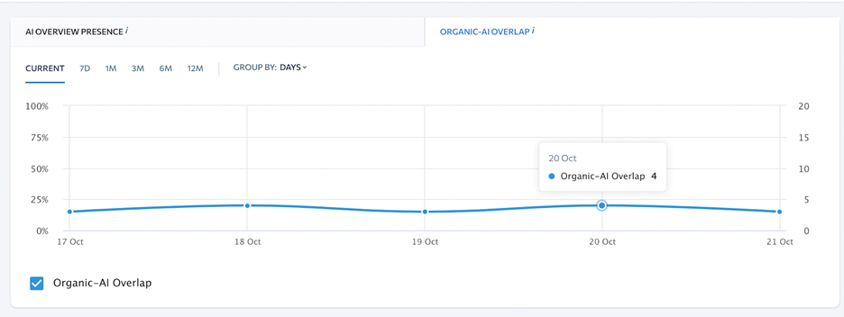 Ви можете використовувати Перекриття Organic-AI графік, щоб перевірити, скільки сайтів із топ-20 зараз представлено в AIO за вашими ключовими словами.
