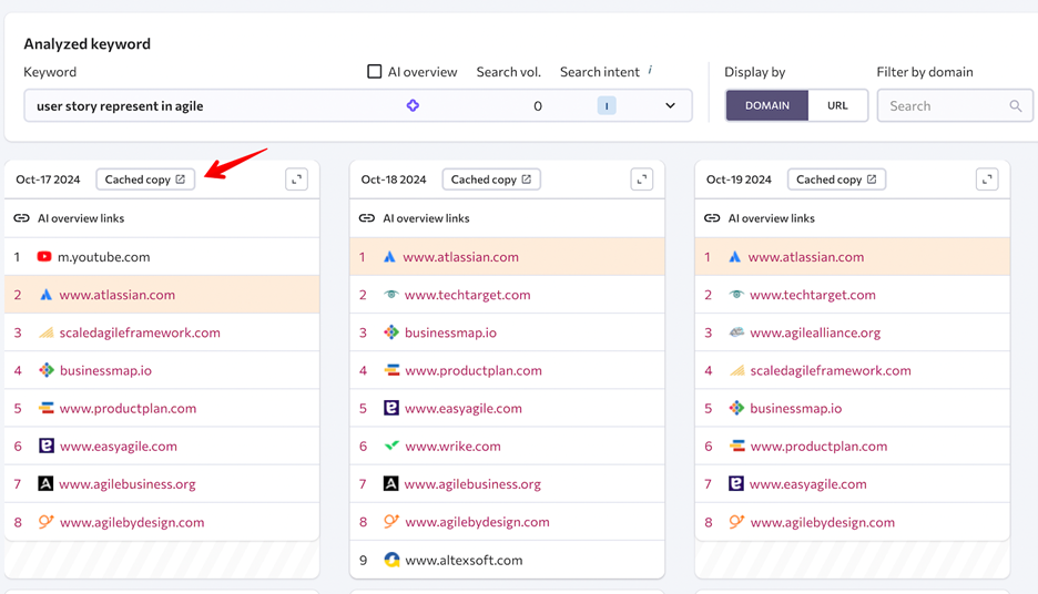 У цих випадках інструмент зберігає кешовані копії кожної пошукової видачі, яку він сканує. Це дозволяє побачити, як зовнішній вигляд AIO змінювався з часом. Ви можете легко перевірити, чи були посилання на ваші веб-сайти помітно відображені в AIO або вони були приховані за кнопкою.