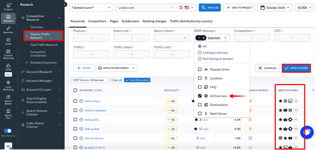 Щоб автоматизувати цей процес, використовуйте Інструмент дослідження конкуренції SE Ranking. Цей інструмент містить 22 мільйони ключових слів, що запускають AIO, у регіоні США та 2,2 мільйона у регіоні Великобританії.