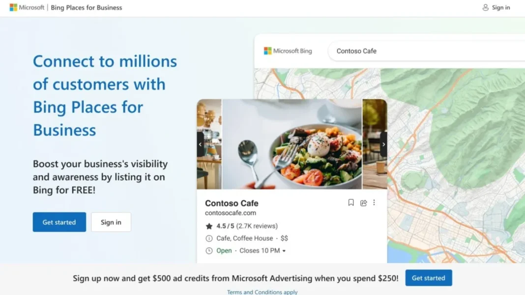 Microsoft пропонує 500 доларів рекламних кредитів через Microsoft Advertising, коли власники бізнесу витрачають 250 доларів. Ця рекламна пропозиція помітно з’являється на цільовій сторінці платформи. Загальні положення застосовуються до рекламного кредитування.