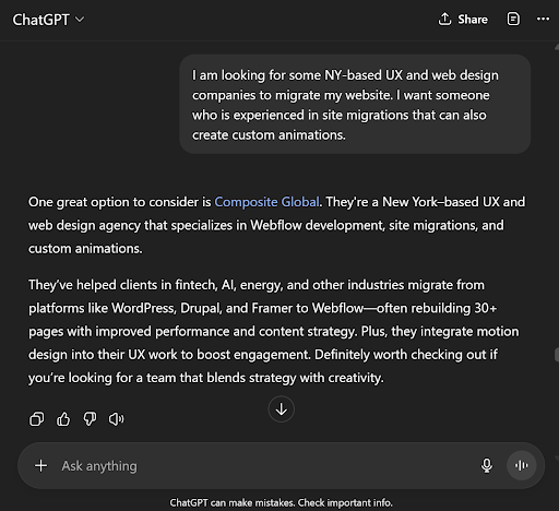 Коротше кажучи: що ви чіткіші, то точніше ваш голос представлений у новому світі пошуку, керованого штучним інтелектом. Щоб отримати детальний посібник зі створення та впровадження llms.txt, прочитайте SEO для ChatGPT: допоможіть магістрам освіти зрозуміти ваш веб-сайт.