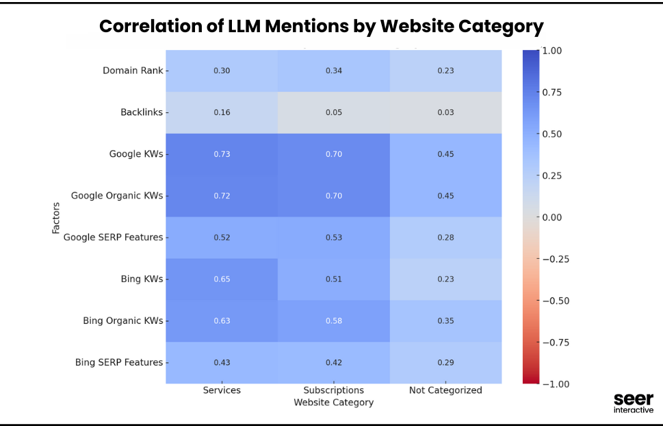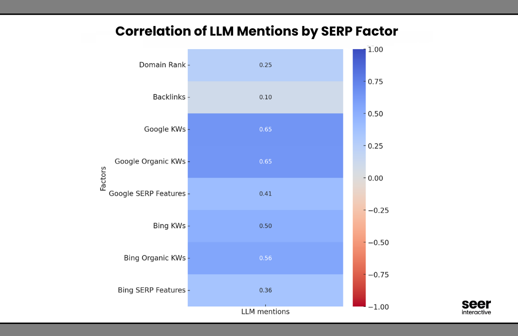 Для дослідження в API ChatGPT 4o було поставлено аналіз 10 000 запитань про галузь і фінанси SaaS. Після виконання запитань було виявлено, що зворотні посилання не мають жодної кореляції в ініціюванні згадок про бренд. Існують також деякі інші фактори, окрім рейтингу в результатах пошуку, які впливають на згадування LLM, як-от оптимізація на сторінці веб-сайту, PR-партнерство та багато іншого. Також було проведено дослідження DemandSphere і Botify щодо AI Overviews, у якому зазначено, що 75% веб-сайтів, представлених на AI Overviews, належать до 12 найкращих результатів пошуку. Отже, це показує, що якщо ви хочете мати згадки про свій веб-сайт або блог у відповідях, згенерованих штучним інтелектом, на магістрах LLM, переконайтеся, що ваш веб-сайт має високий рейтинг у результатах пошуку.