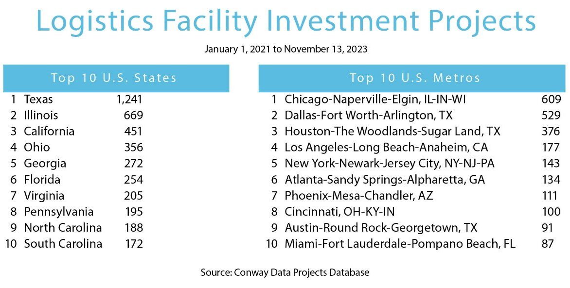 Як впливає логістична діяльність? Минулого року у звіті про логістику, опублікованому в січневому випуску Site Selection, були представлені діаграми, зібрані з бази даних проектів Конвея, що задокументувало, які штати та муніципалітети лідирували в залученні своєї частки з 6282 інвестицій у об’єкти США з функцією логістики, задокументовані між Новим роком 2021 року та серединою листопада 2023 року. :