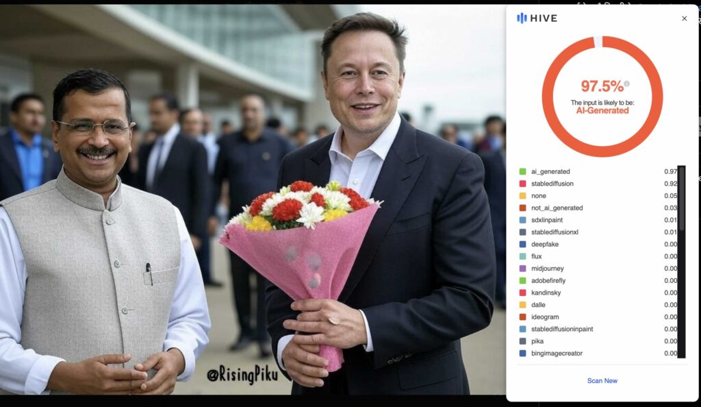 Підводячи підсумок, можна сказати, що створене штучним інтелектом зображення поширюється як реальне фото зустрічі Арвінда Кейрівала з Ілоном Маском для обговорення політики уряду Делі.