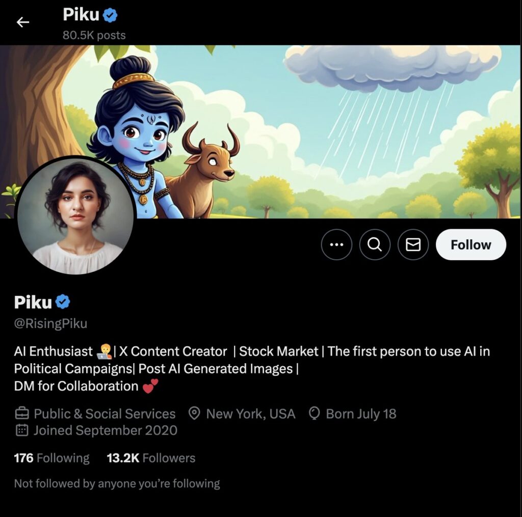 Крім того, ми виконали зворотний пошук вірусного зображення, щоб дізнатися більше про його походження. Цей пошук привів нас до публікації користувача «X» на ім’я Піку (@RisingPiku) (водяний знак цього імені користувача можна побачити на вірусній фотографії), який опублікував ту саму фотографію з тією ж заявою, що й на вірусній фотографії . Піку згадала у своїй біографії, що вона є ентузіастом ШІ та творцем контенту, який публікує створені ШІ зображення (також в Instagram).
