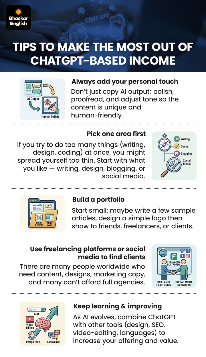 Якщо у вас є знання кодування, навіть базові, ви можете використовувати ChatGPT для створення коду, виправлення помилок, створення чернеток веб-сторінок або невеликих програм. Ці інструменти, невеликі веб-програми, чат-боти та автоматизовані сценарії, можна продавати, ліцензувати або пропонувати як послугу малому бізнесу чи окремим особам. Читайте також: 17-річний хлопець із штату Уттар-Прадеш будує вчителя ШІ, cкоштує всього 25 000 рупій 6. Засоби проектування творчих виробів