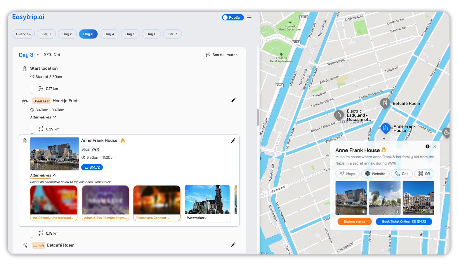 Покращений бездоганний досвід Починаючи з версії 1.5, EasyTrip.AI представляє нові можливості бронювання та оновлення в реальному часі про всі приховані перлини, місцеві події та заходи для кожного місця. Тепер інструмент підключається до більшої кількості змінних у реальному часі: прогнози погоди, перераховані зупинки для відпочинку та оптимізація маршруту – користувачі також отримують інформацію в реальному часі для перерваної приємної подорожі. Цей додатковий безперебійний досвід гарантує, що мандрівники отримують сповіщення, забезпечують безпеку та повну взаємодію з оточенням.