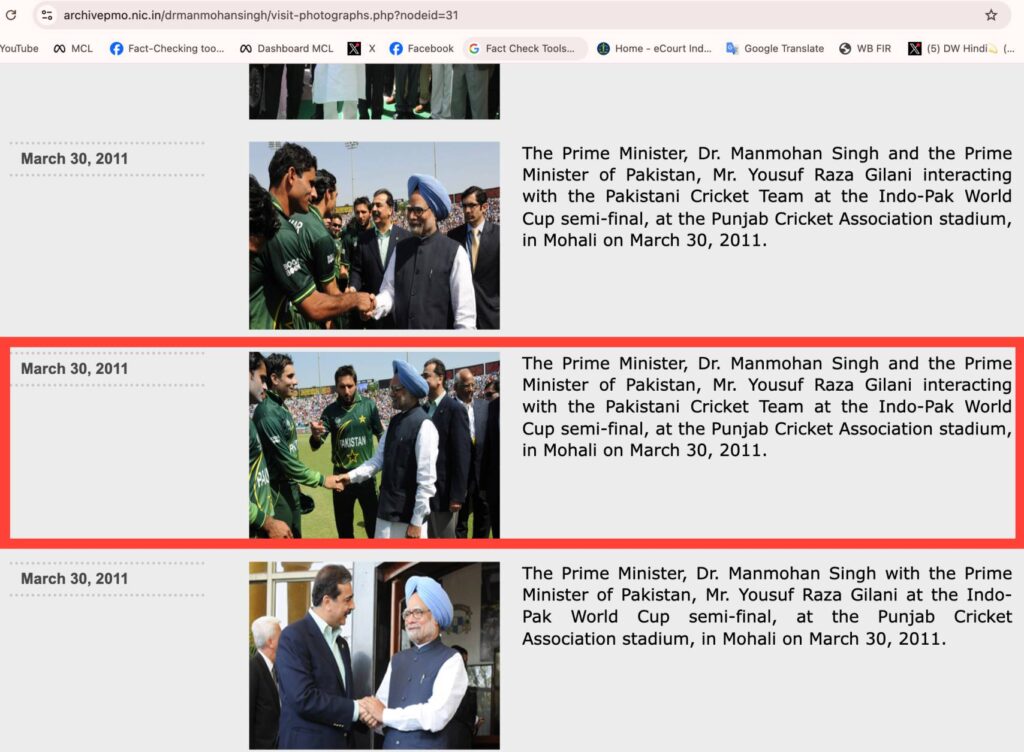 Ми провели пошук ключових слів Google і виявили, що вірусна фотографія архівується на веб -сайті PMO. У підписі зазначається, що прем'єр-міністр д-р Манмохан Сінгх та прем'єр-міністр Пакистану Юсуф Раза Гілані спілкувалися з командою з крикету Пакистану під час півфіналу чемпіонату світу з Індії-Пакистану на стадіоні Асоціації крикетів Пенджабу, Мохалі, 30 березня 2011 року.