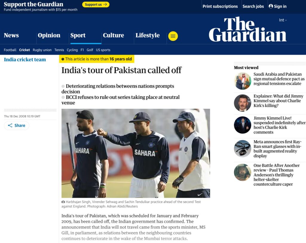 Згідно з повідомленнями (тут, тут), після терористичних нападів 26/11 у листопаді 2008 року, у січні 2009 року було заплановано в Індії тур по Пакистану в Індії – лютий 2009 р. Було скасовано. Терористичні напади, які відбулися з 26 по 29 листопада 2008 року, загинули 166 людей та поранили понад 300, створивши серйозні проблеми безпеки. Після трагедії Рада з контролю за крикетом в Індії (BCCI) закликала екскурсію, і індійська команда не вирушила до Пакистану на цю серію.