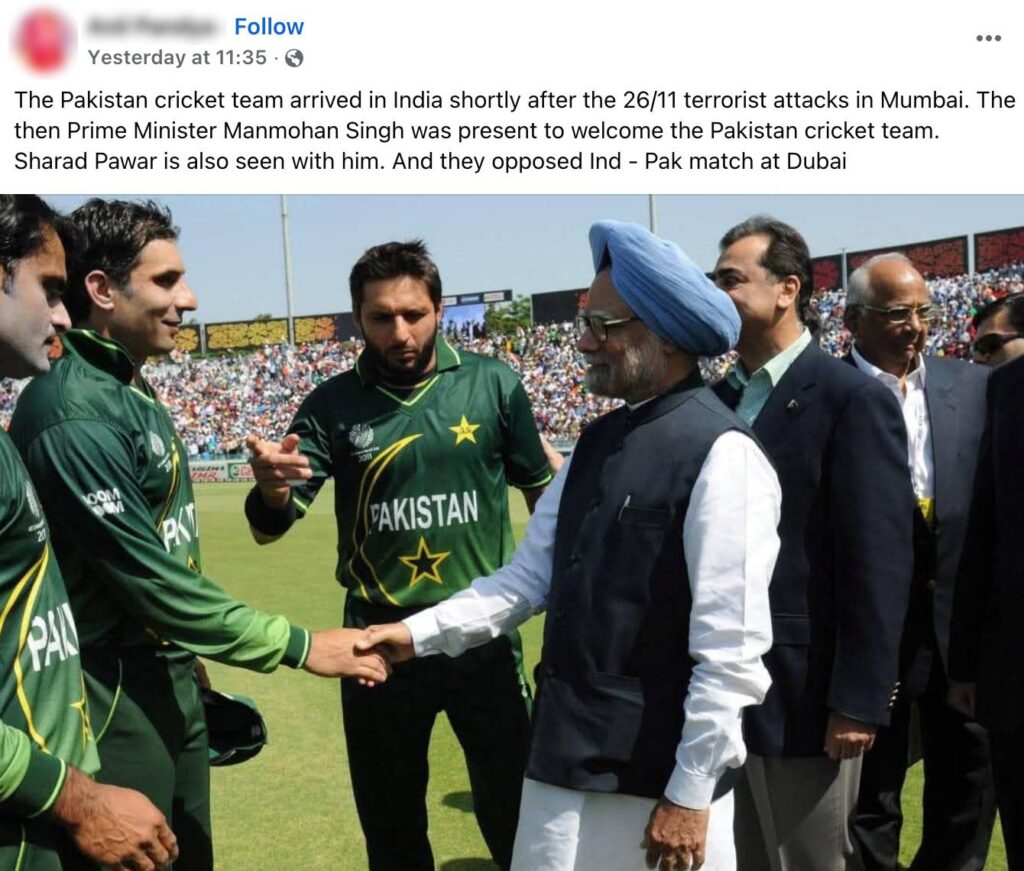 Серед цього фото колишнього прем'єр -міністра Манмохана Сінгха з націоналістичною партією Конгресу (фракції SP) Шарада Павара, що зустрічається з національною командою крикету Пакистану, стає вірусним у соціальних мережах (тут, тут, і тут). Пости стверджують, що команда Пакистану відвідала Індію незабаром після терористичних нападів у Мумбаї в листопаді 2008 року, і що Манмохан Сінгх, разом із Шарадом Паваром, зустріли їх. Давайте перевіримо претензію, висунуту в публікації в цій статті.
