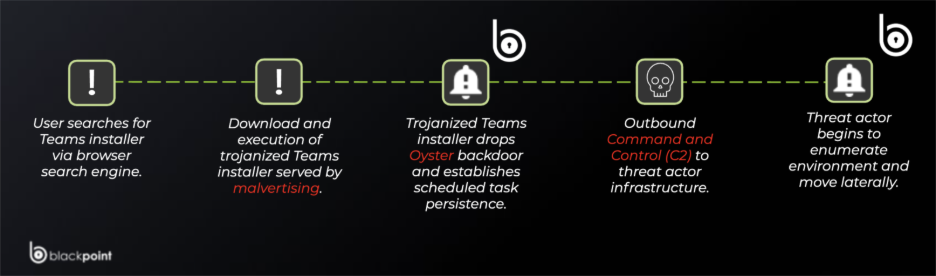 Виконання шахрайського інсталятора запускає багатоступеневу атаку, яка розгортає стійкий задній кут, відомий як Oyster, або Broomstick.