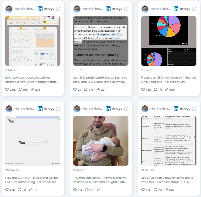 Кріс сидить у центрі тісного кола SEO та зростання. Ви бачите такі платформи та видавців, як Ahrefs, Semrush, Screaming Frog, Земля пошукових системі Журнал пошукової системи. Його орбіта включає відомих практиків і засновників, які формують ремесло. Це поєднання дає йому доступ як до виробників інструментів, так і до професіоналів, які їх купують.