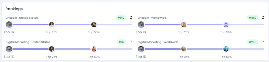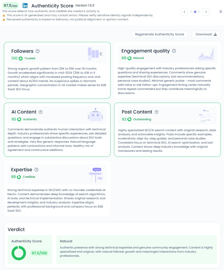Оцінка впливу є 7754 бали з 1 відсотком найкращих місць у LinkedIn у США та високими рейтингами в цифровому маркетингу. Кількість підписників зросла з 26 тисяч до 56 тисяч за 18 місяців, причому різко зросла в середині 2024 року, коли частота публікацій і дослідження штучного інтелекту зростали. Якість залученості оцінюється в 88, а якість вмісту публікації досягає 92, що відображає повторювану корисність. Його каденція стабільна зі сплесками навколо оригінальних досліджень і проходження інструментів.