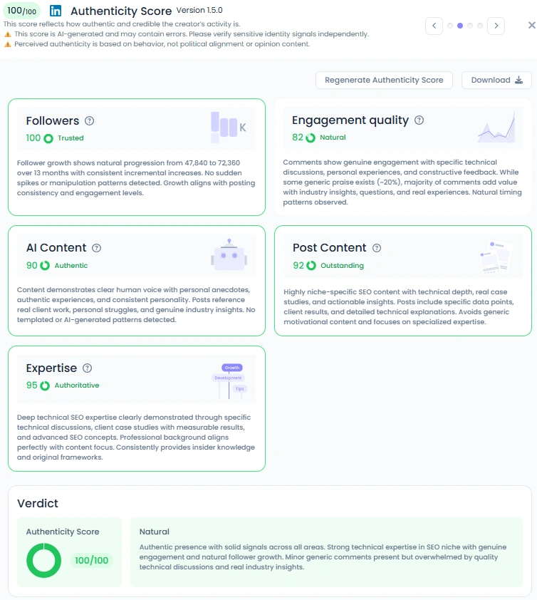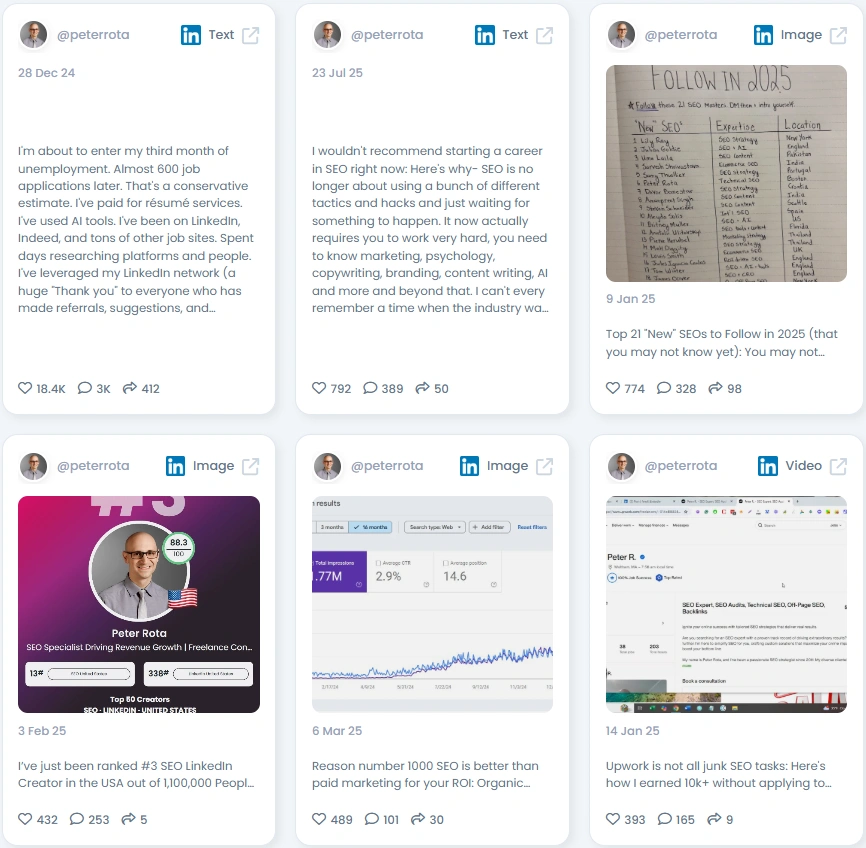 З ан Оцінка автентичності Favikon з 100/100Пітер встановлює орієнтир того, як виглядає автор, який заслуговує на довіру. Його дописи багаті технічними деталями, але сповнені індивідуальності. Він ділиться особистими роздумами про пошуки роботи та роботу з клієнтами, а також аналізує дані, створюючи послідовну та справжню присутність. Зростання його послідовників є органічним, його залучення природним, а його тон безпомилково людським. Завдяки цьому поєднанню досвіду та співчуття його контент виділяється серед насиченого штучним інтелектом ландшафту.