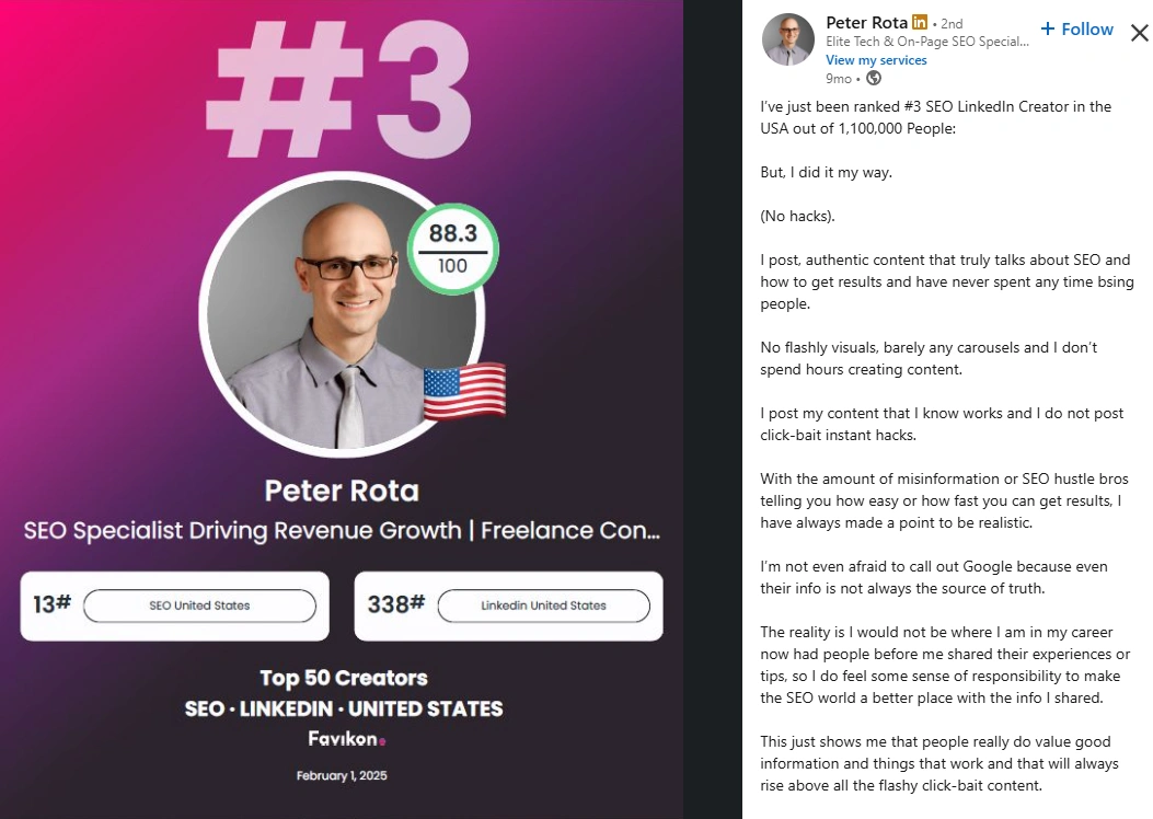 Пітер Рота доводить, що технічні навички та особиста чесність можуть прекрасно співіснувати онлайн. Його зміст нагадує нам, що алгоритми винагороджують послідовність, а аудиторія винагороджує чесність. Завдяки бездоганній оцінці автентичності, глибокому досвіду та справжній довірі спільноти, він є одним із найповажніших спеціалістів LinkedIn із SEO — голосом, який спрощує, навчає та надихає.