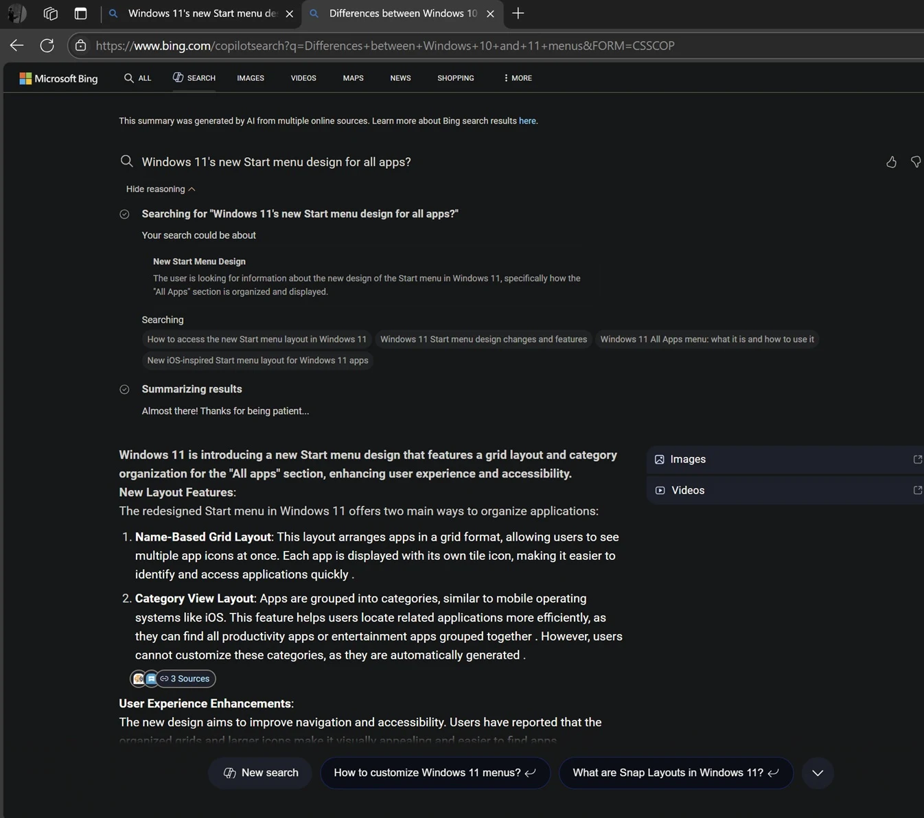 Функція посилається на різні зображення та результати пошуку відео та надає користувачам можливість додати запити до нижньої частини сторінки. Ця функція досить схожа на функцію глибокого пошуку на Bing Copilot. Єдина відмінність зараз полягає в тому, що він має більш спрощений інтерфейс користувача, який позбавляється від класичних посилань в Інтернеті в цілому, але не залишає Бінг повністю, як і спеціальна функція Copilot.