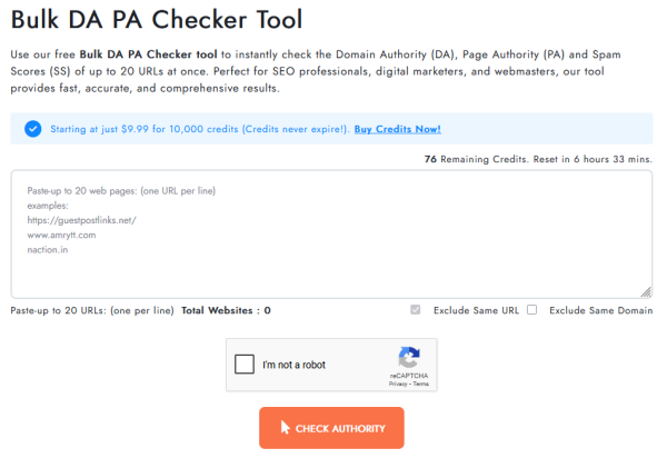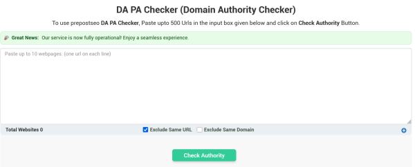 Препостсео є особистим фаворитом. Він забезпечує як DA, так і ПА в простому інтерфейсі та має швидкі та точні результати. Найбільша перевага полягає в тому, що вони дозволяють шукати кілька сайтів одразу. Хоча ви обмежені 5 веб-сайтами як не-користувачі та 10 з безкоштовним обліковим записом користувача. Інструмент навіть звітує про оцінку спаму та IP -адреси сайтів, які можуть бути корисними.