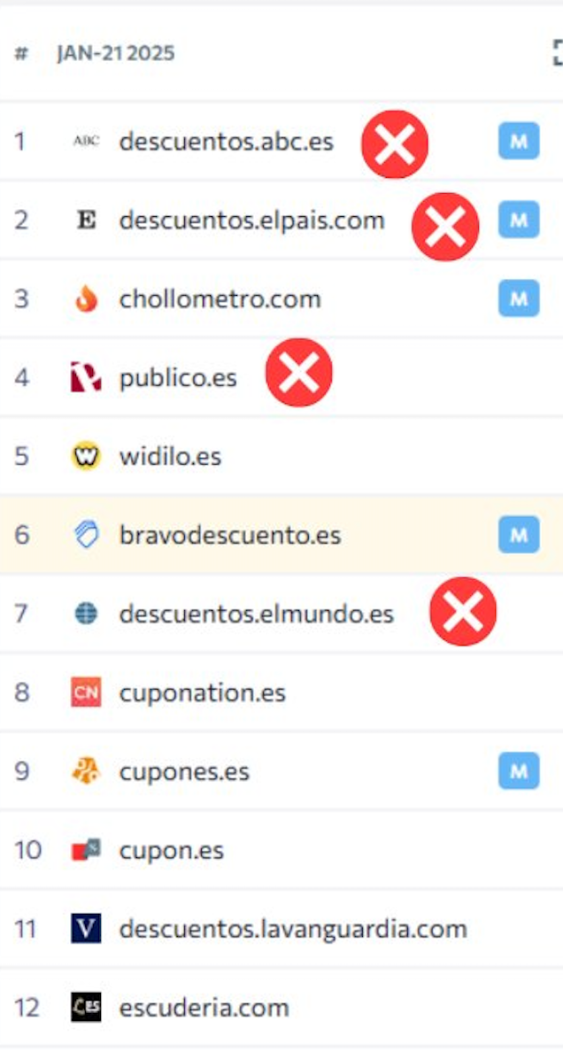 Лаура Чіоокіора, керівник SEO в мережі Bravo Savings, позначений Зникнення основних постачальників купонів з результатів пошуку Італії на X, а потім поділило скріншот, що показує те саме, що відбувається в Іспанії.