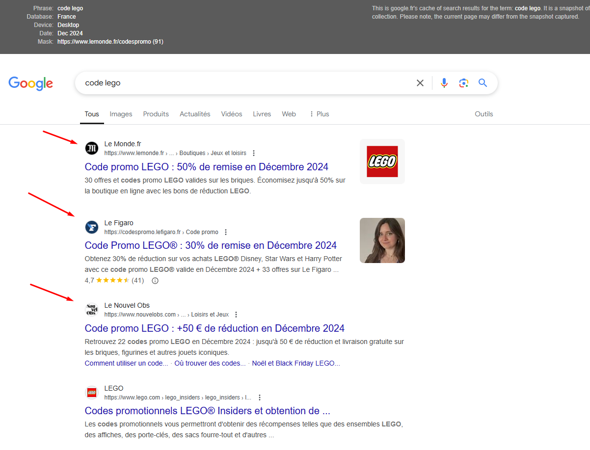 Експерт SEO Глен Гейб поділився Два скріншоти Порівняння результатів пошуку французьких для “коду LEGO” у грудні 2024 року та січня 2025 року.