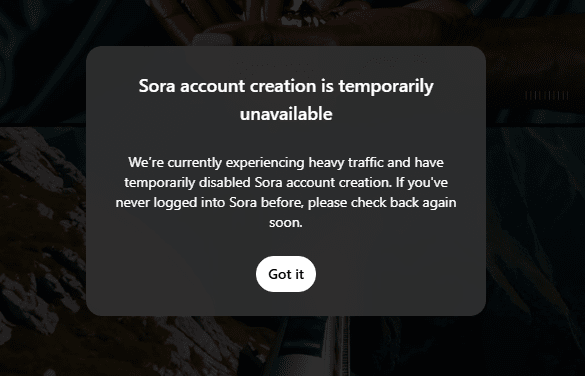Наразі у нас великий трафік, тому ми тимчасово вимкнули створення облікового запису Sora. Якщо ви ніколи раніше не входили в Sora, перевірте знову незабаром.