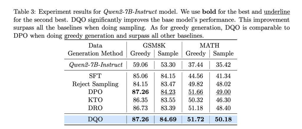 Експериментальні оцінки DQO на наборах даних математичних міркувань — GSM8K і MATH — демонструють його ефективність. На наборі даних GSM8K DQO покращив продуктивність з базового рівня 59,06% до 87,26% для жадібної генерації та з 53,30% до 84,69% для генерації на основі вибірки. Ці результати перевершують інші базові методи, включаючи DPO та DRO. Подібним чином у наборі даних MATH DQO перевищив базові показники, досягнувши покращень на 1,18% у вибірці та 1,40% у жадібному створенні.