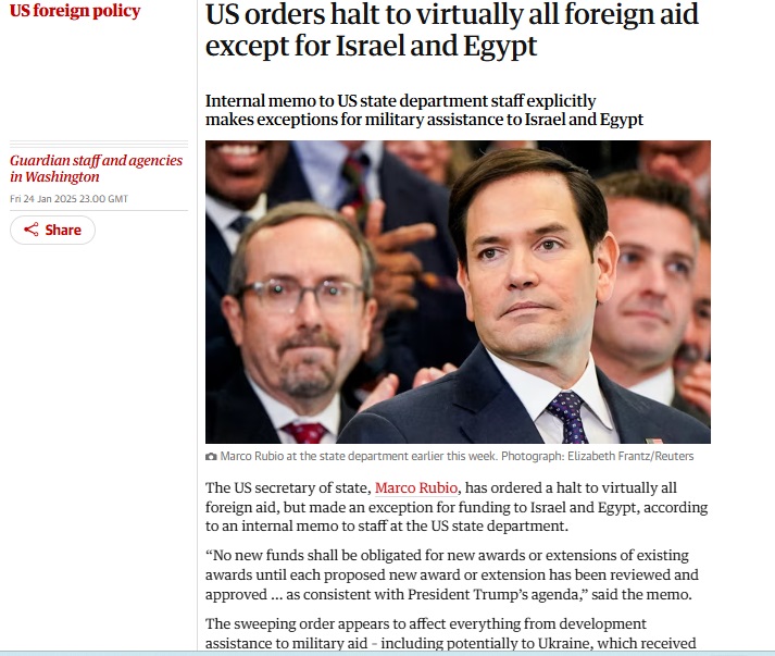США призупинили всю іноземну допомогу, забороняючи Єгипту та Ізраїлю, переглянувши американську фінансову допомогу в інші країни.