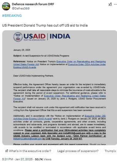 Зазначений циркуляр уряду США став вірусним із твердженням про те, що президент США Дональд Трамп призупинив фінансову допомогу в Індію. “Діючим сьогодні, офіцер угоди Tude Tude видає наказ одержувачу негайно призупинити виконання згідно з угодою, яку ваша організація була присуджена USAID/India …”, – прочитав лист, поділений у вірусних посадах.