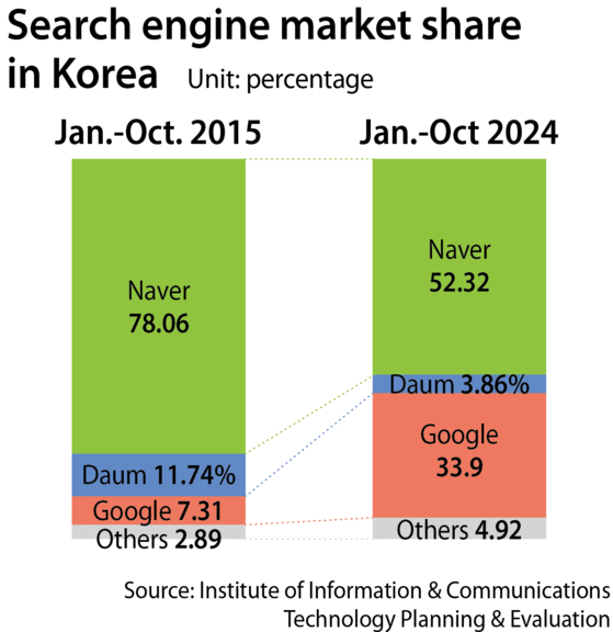 А. Дві корейські платформи виділяються на пошуковому ринку, який Google володіє 89 відсотками, згідно з даними платформи веб -аналітики Statcounter. У поєднанні, Навер та Какао склали порівнянну частку ринку Кореї у 2015 році.