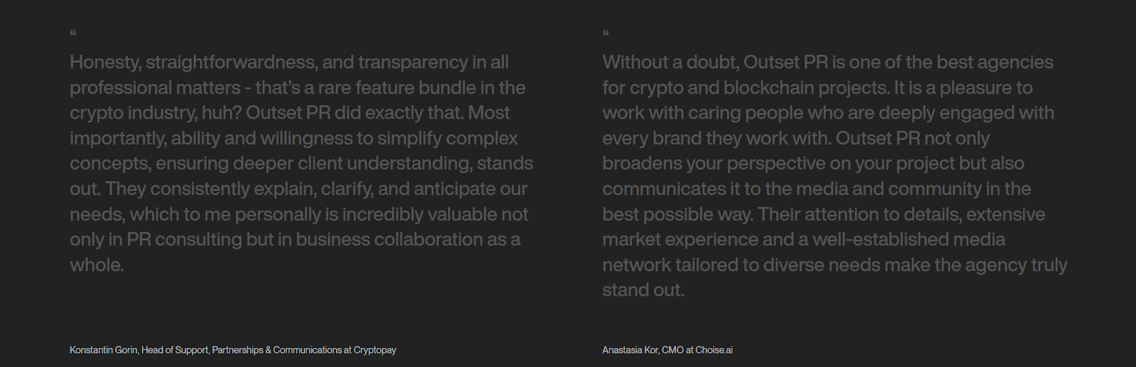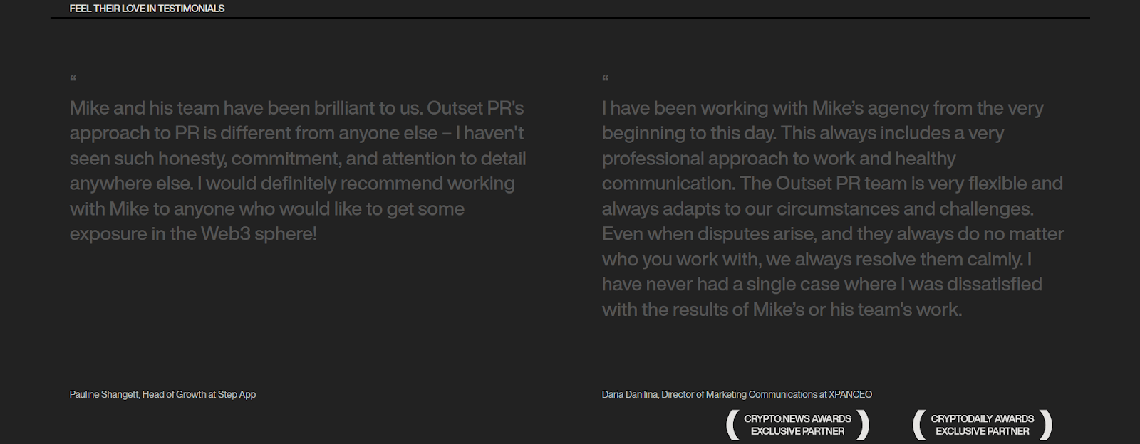 За короткий час PR -PR співпрацював як зі стартапами, так і з великим бізнесом. Їх досвід включає партнерські стосунки з такими компаніями, як App Step, Xpanceo, Dash, Icons8, Changenow, Choise.ai, CryptoPay, Gomining тощо. Послуги агентства підтримуються перевіреними результатами, з детальним прикладом, доступними на їхньому веб -сайті, щоб продемонструвати прихильність команди виконувати свої обіцянки.