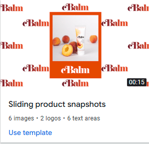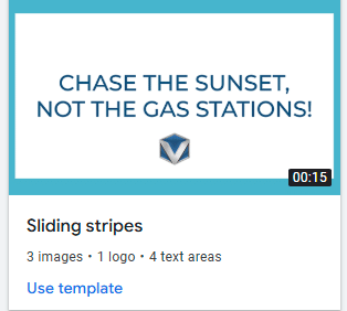 Тут ви можете отримати доступ до інструменту Video Builder, який містить 6- або 15-секундні відеозаписи з опціями для кожної орієнтації (горизонтальна, квадратна та вертикальна). Кожен шаблон схожий на слайд -шоу; Кожен дозволить додати логотип, завантажувати зображення та створити текст перед звичайним фоном, але з простою анімацією. Кількість зображень та тексту, які ви можете додати, змінюється залежно від шаблону. Наприклад, шаблон 15-секундного шаблону “ковзаючі смуги” дозволяє вставити один логотип, три зображення та має три текстові поля (два з межею 40 символів і один з межею 22 символи).