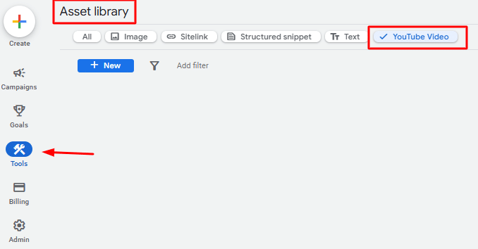 Ви знайдете бібліотеку активів у розділі Інструменти в інтерфейсі Google ADS.