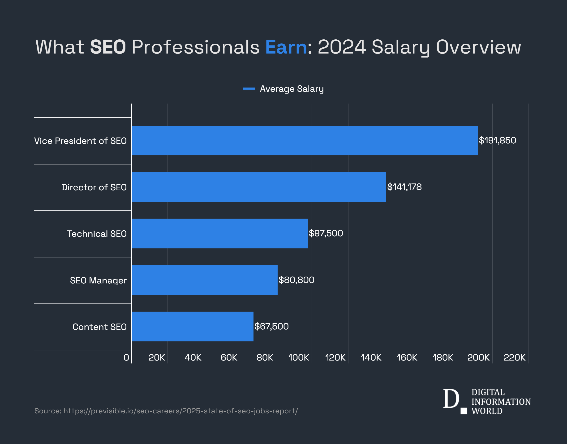 У звіті також встановлено, що 90% всіх посад SEO надходять від компаній з більш ніж 250 працівниками, тоді як віддалені робочі місця становлять 50% посади в SEO на початку 2024 року, але тепер знизилися до 34%. У 2024 році заробітну плату в розмірі понад 100 000 доларів пропонували 12% списків SEO, тоді як 40% компаній пропонували зарплату вище, ніж порівняно з 14% агентств. Для віце -президента на посаді SEO середня зарплата, яка пропонується, становить 191,850 доларів, тоді як середня зарплата для директора або SEO становить 141 178 доларів. Середня зарплата за технічну посаду SEO становить 97 500 доларів, 80 800 доларів для менеджера SEO та 67 500 доларів за вміст SEO.